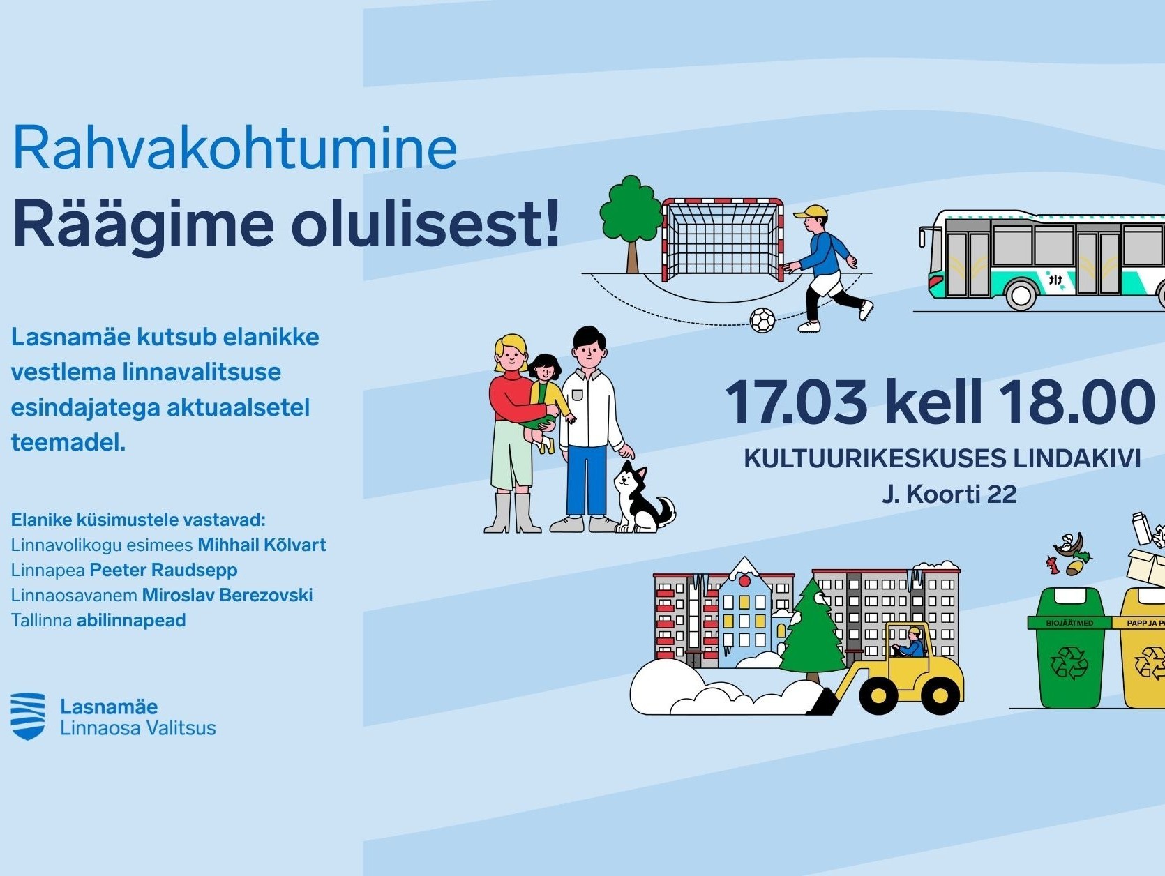 Teisipäeval, 17. märtsil Kultuurikeskuses Lindakivi toimub (J. Koorti tn 22) rahvakohtumine, kus Lasnamäe elanikel on võimalus arutada linna ja linnaosa arenguküsimusi otse Tallinna juhtide ja esindajatega. Kohtumine toimub kell 18.00 eesti keeles ja kell 19.15 vene keeles.